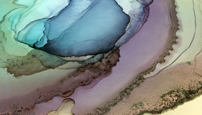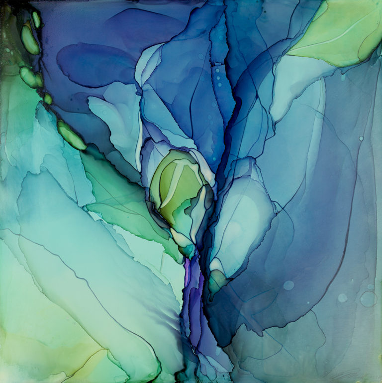 Andrea works primarily on Ampersand’s Claybord. She says, “Claybord is my favorite because it can be used in so many ways. There’s just nothing else like it. The clay coating is perfectly smooth, so it is fantastic for drawing and painting delicate lines. “She continued, “I also love Encausticbord , Aquabord, and the Primed Smooth Artist Panel.” She uses dye based pigments miscible with alcohol, pigmented inks miscible with water and acrylic paint. She works with her personally developed system that includes a carefully mixed color palette, paint pours and drawing. The evolution of the artwork happens sometimes as the panel is flat and other times on the easel. Upon completion, Andrea finishes her work with a system of varnishes to protect the work from ultraviolet light, abrasions, and airborne pollutants.