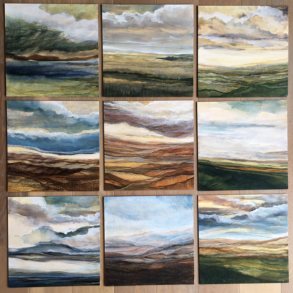 Q: With that in mind, you created a series of nine paintings meant to interact together as a group or stand on their own. Does the whole series represent one larger idea?