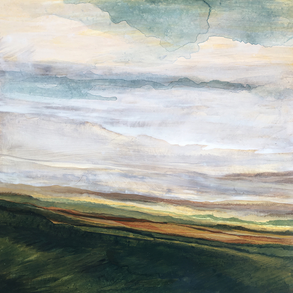 A: Every time I move, I collect something new from the landscape. I grew up in Chester County, Pennsylvania surrounded by rolling farm fields that fade into the horizon. When I moved to an island in Greece, the flatness of the sea became a prominent feature in my imagery - as well as the thin subtle lines of the distant islands. Ecuador showed me an entirely different type of landscape with huge mountains and tremendous clouds - for the first time, the clouds moved down into the land in my paintings, I had never seen that until I lived in Quito. Where we lived in Germany was very similar to the landscape I grew up with in Pennsylvania. My paintings returned to the rolling hills with some new colors. There are almost neon yellow fields of rapeseed that showed up in a lot of my work. Now back in a mountainous city, Bogotá has reminded me a bit of Quito with the way the clouds move through the valleys. I think the shift from country to country doesn’t always happen in the first year or two I am living there. Sometimes it takes quite a while of living in the new environment for the colors, shapes, and lines to seep into my psyche and eventually find their way onto the panel.