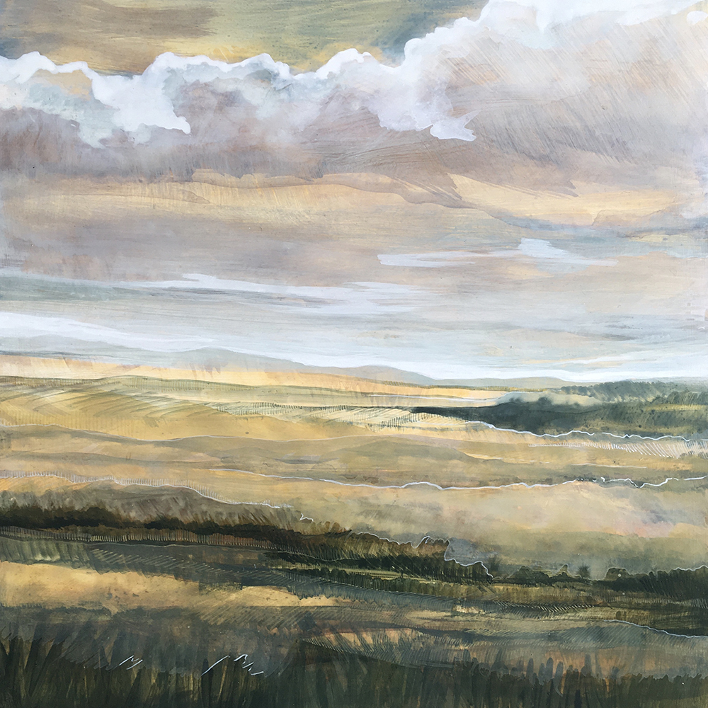 The Claybord panel absorbs the paint really well - it is easy to get a washy feeling like watercolor. Once this layer has dried, I will flood a translucent whitewash over the sky that will begin to form the clouds. At this point, I have a panel filled with lots of intentional and unintentional marks, splatters, and brush strokes. I use these as a framework to begin building a landscape. I use lots of small lines to make shapes and planes. I go back and forth between thinking about the actual elements of the landscape I am painting, and just responding to the paint and how it is interacting with what is already on the panel. When I have finished the painting, I put 2-3 layers of varnish that give the panel more depth and a soft sheen.