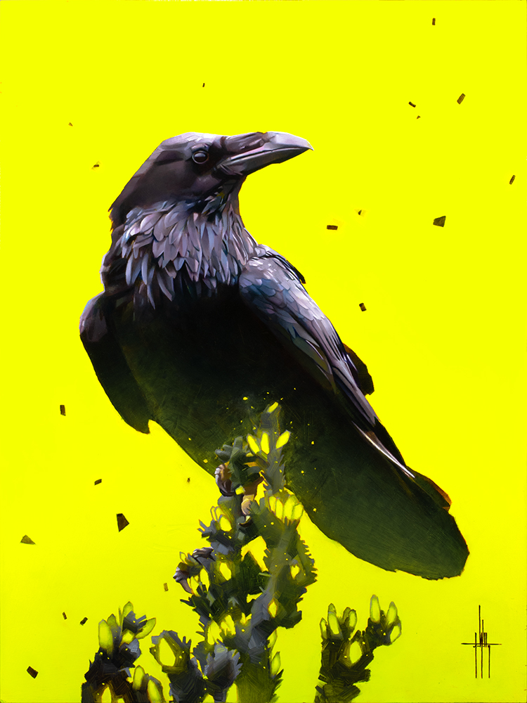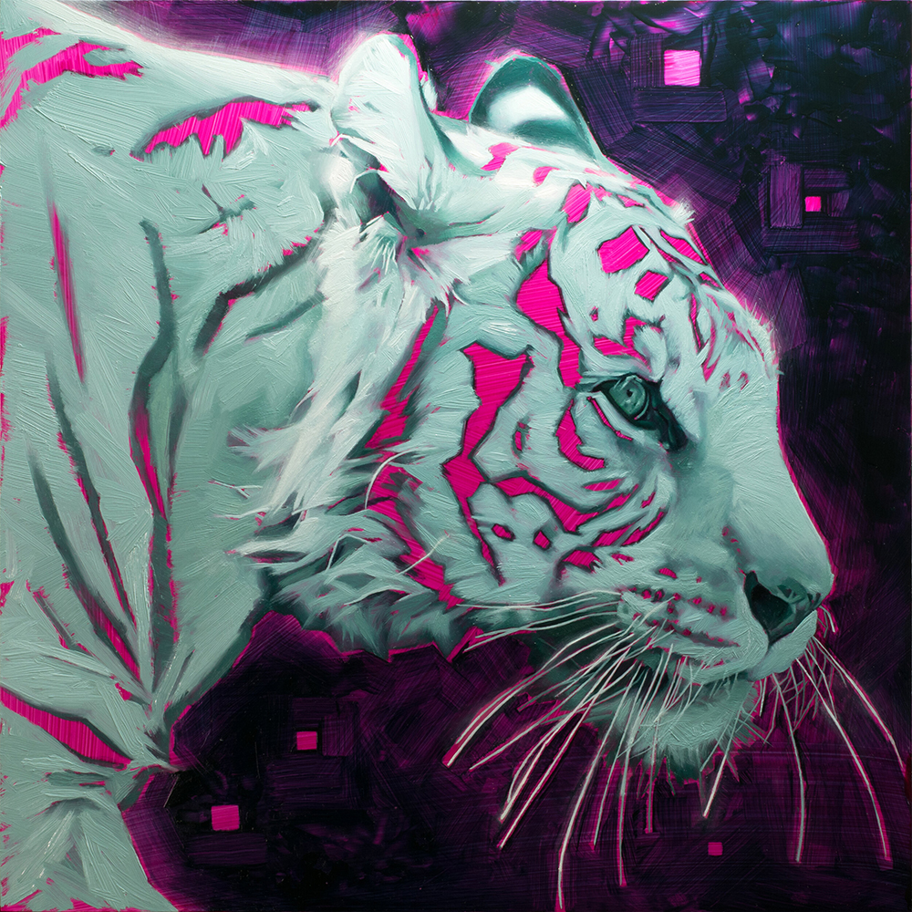 I did; I’d like to add that video games had a hand, too, maybe even more so. I also always respected very technical realism because it objectively determined one’s skill level. So, a blend was probably always inevitable. Video games and comic book elements may manifest in my work today mainly through the glow, clean application, geometric qualities in the marks, sometimes dynamic poses, graphic design elements, textures, and tessellation patterns. So, what? BASICALLY EVERYTHING. For instance, I might dynamically pose an animal because of my comic book ties, but I think a much more interesting take-away for the reader here would be my inspiration for glow. My exposure to ‘bloom-lighting’ while playing my favorite video games growing up was so inspiring. As defined by trusty Google -
