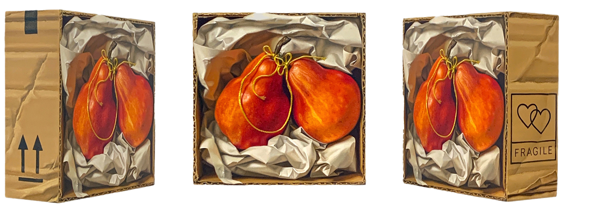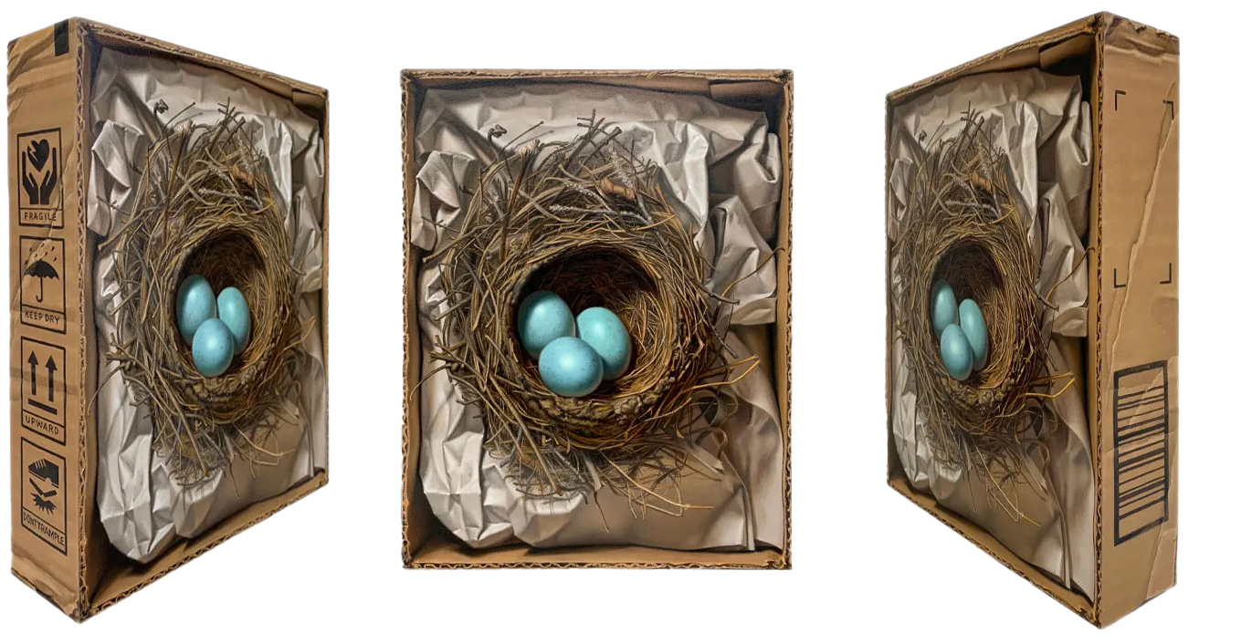 I love making art as an object - it’s a very niche part of Trompe l’oeil painting. Three-dimensional panels like the Ampersand cradled panels give you a chance to communicate something extra special to the viewer. I had known about Ampersand panels for years but hadn’t tried them until I thought of doing my cardboard box series. The two-inch deep panels were perfect for creating the illusion of a cardboard box. Painting the sides to look like cardboard and the narrative side ‘stamps’ are some of my favorite parts of those paintings.