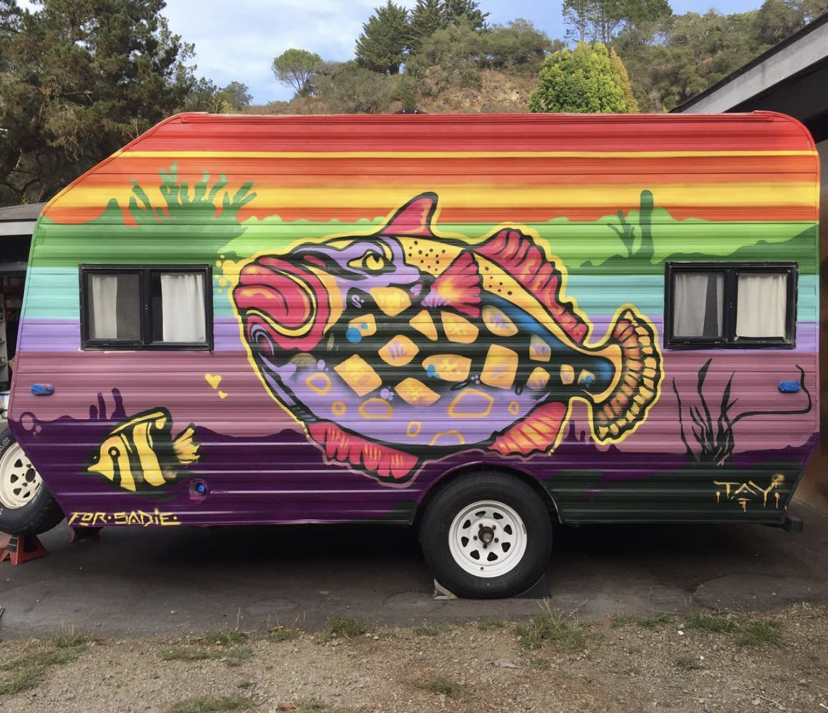 A: That project was unlike any other mural for me because of all the footwork it took to make a project of that scale come to life. I worked with the City of Santa Cruz, Cal Trans, School District, Economic Development, and Clean Oceans International for two years. We wrote grants with the city, local foundations pitched in, and just over 1400 individual contributions from the local community. We worked with the students at Bay View Elementary to pick the species most affected by plastic pollution in our Monterey Bay. Working with my ten best friends to paint the largest mural in our town has been one of my favorite moments of my life.