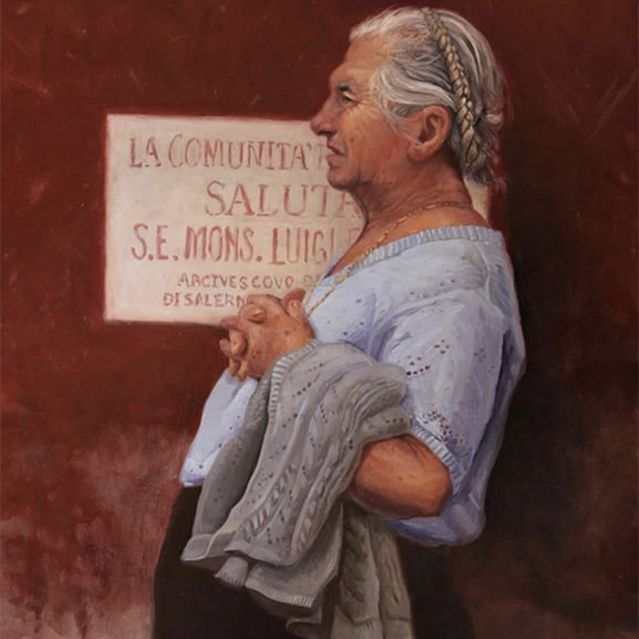 This painting was inspired by a woman that was watching a procession in a small piazza in Italy. I am usually inspired by a particular subject, light quality, shadow pattern, or overall mood based on a life experience. When not able to work from life, I try to work from a combination of quick sketches, color studies, and photographs.