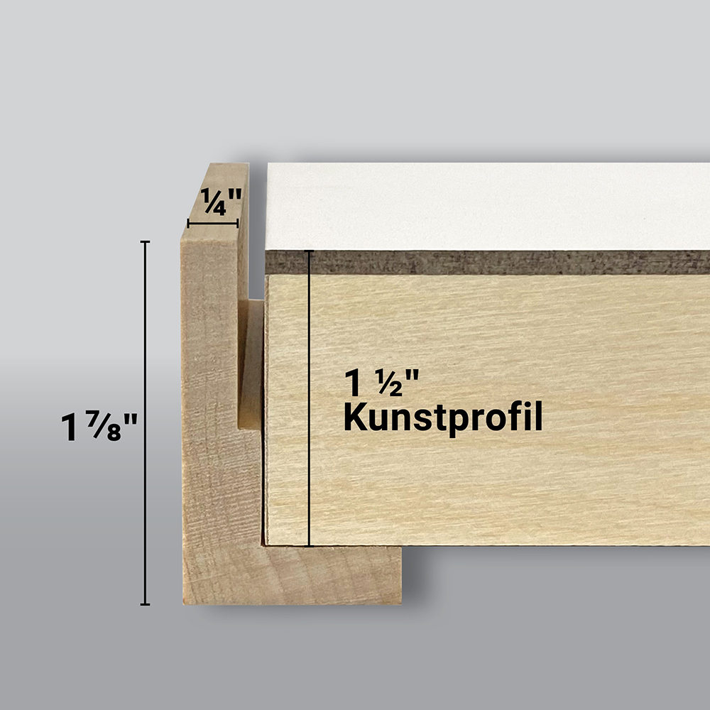 Wählen Sie das 22-mm-Profil (inklusive Setzstufen) für flache und gerahmte Tiefen bis zu 22 mm. Oder wählen Sie die 38-mm-Option für 38 mm tiefe Kunstwerke mit Rahmen.