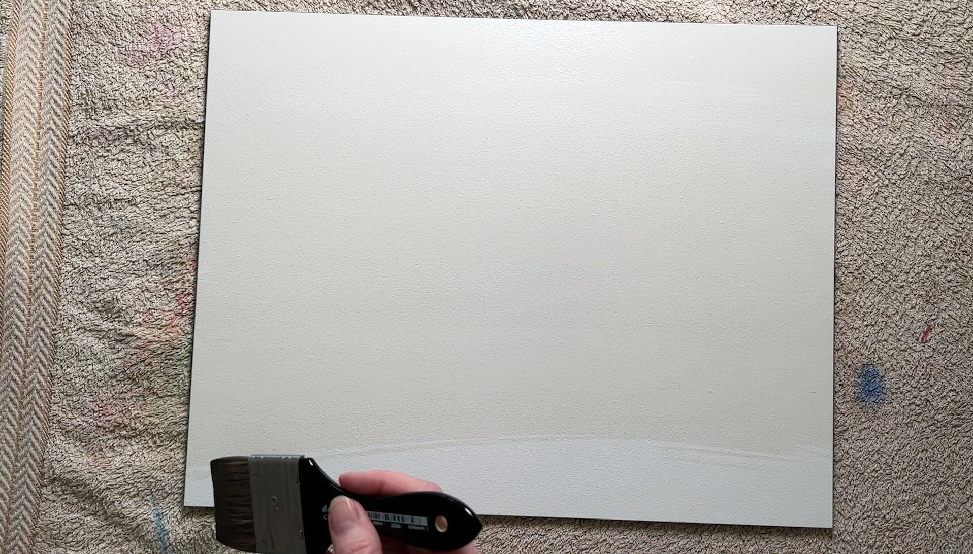 Make sure you have an old towel or some paper towel nearby to blot your brush on after loading it with paint. Maintaining the wetness level in the brush is important.