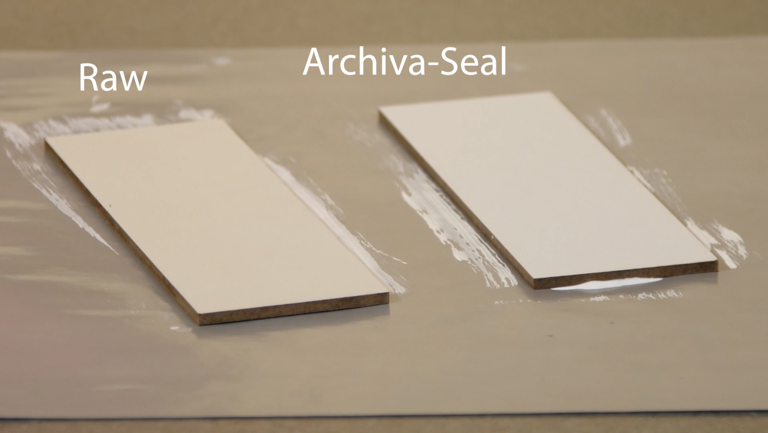 Here’s a piece of raw, uncoated hardboard. And here’s a piece of hardboard prepared with Ampersand's Archiva-Seal™. We’ll apply acrylic gesso to both pieces and let them dry. See the color difference between the raw board (left) and the Archiva-Sealed board (right)?