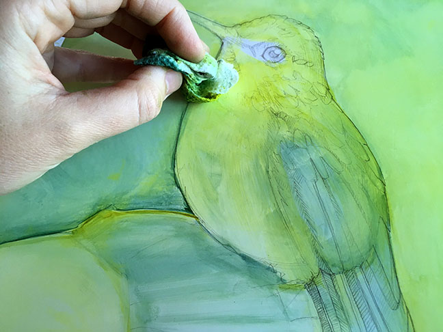 The smooth surface of Claybord allows a little more time to lift the High Flow. Use a paintbrush saturated with water to subtract areas of color.