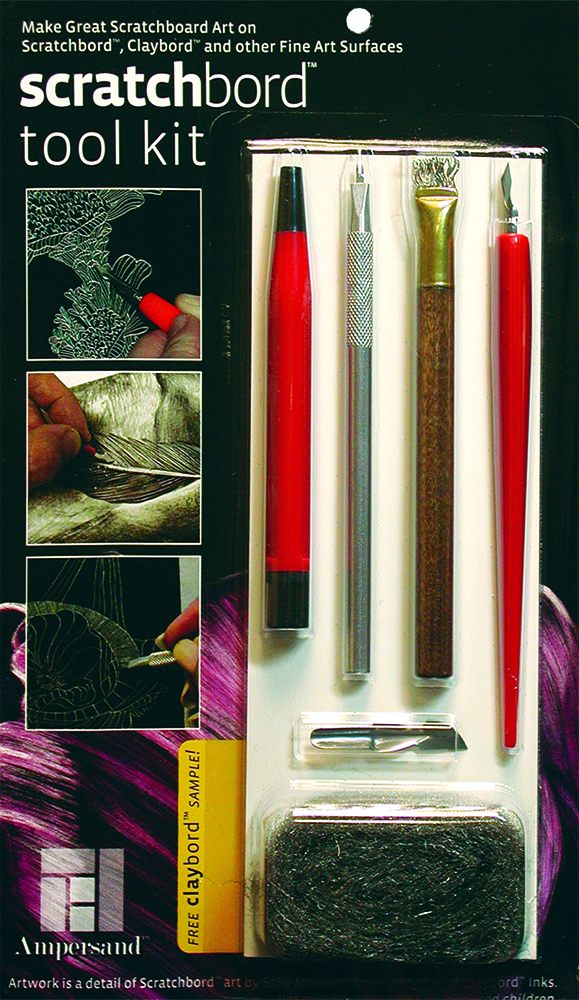 Anything abrasive is a scratchboard tool, but the right tool can make the right mark or texture. Ampersand offers scratchboard tools designed to create a wide range of breathtaking textures. Available for sale individually or in kits, these tools include A Scratchbord Knife with a curved and fine nib, a Line Tool, a Fiber Brush, a Wire Brush, and oil-free Steel Wool.