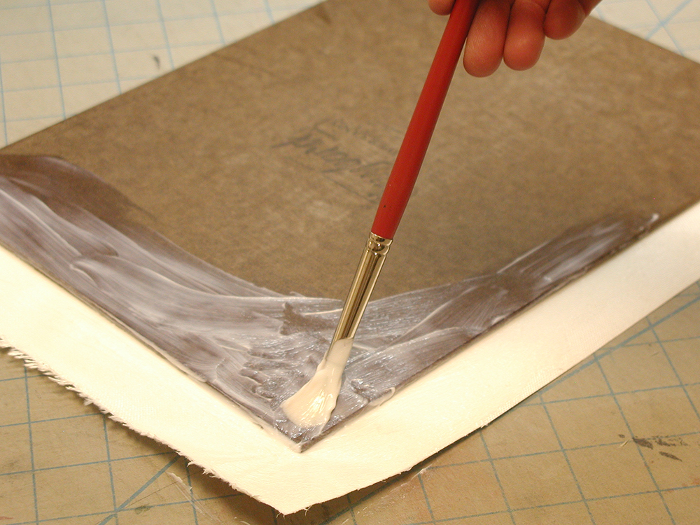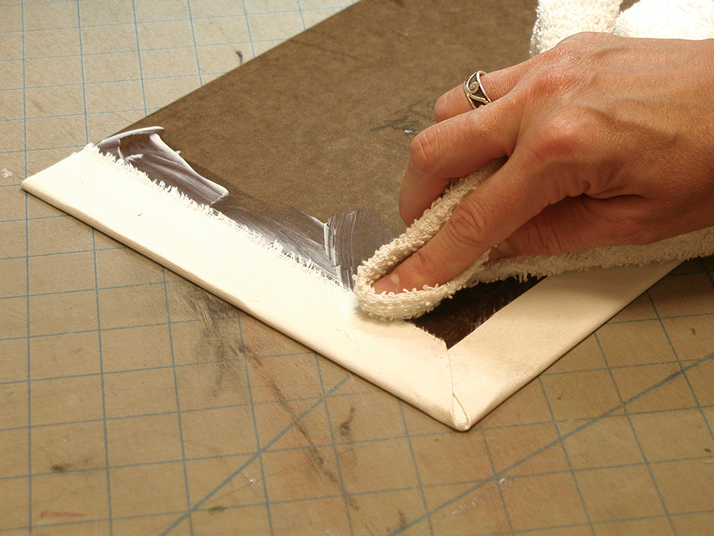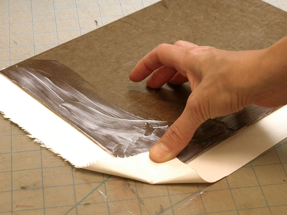 Be sure to coat the sides of the panel so that the fabric adheres properly all the way to the edge. You can apply extra gel medium or glue at the four corners because they are the most vulnerable to lifting. Keep applying medium or glue until you have a fairly thick evenly wet coat. Quickly move to the next step.