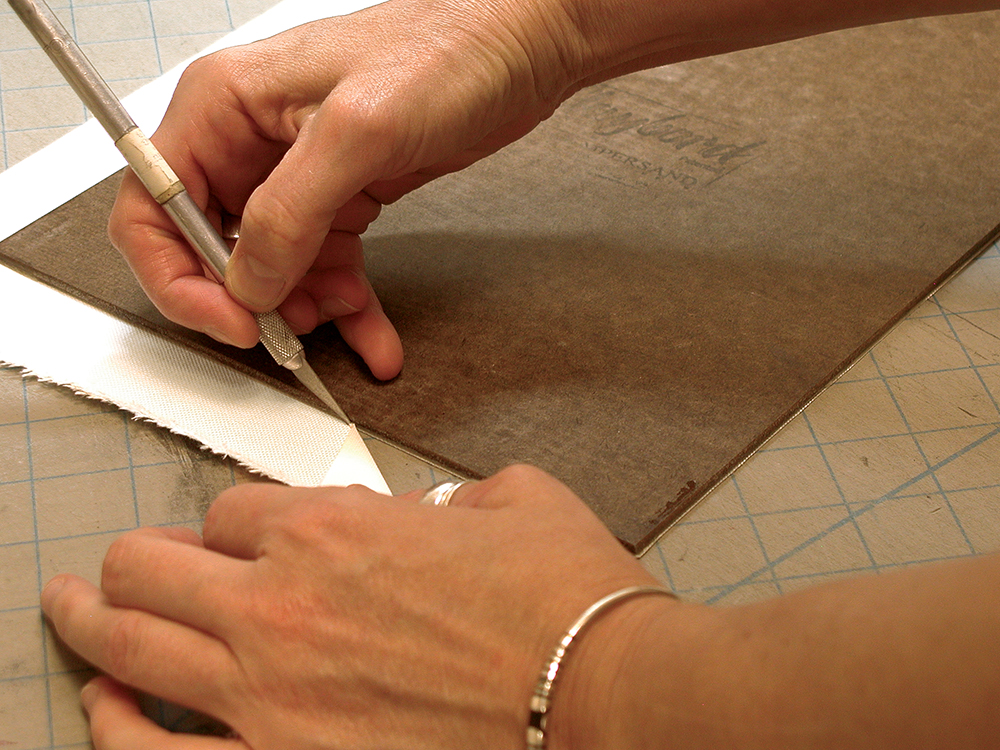 Step 1: Begin by trimming the canvas or linen to size. Allow for a 2" overlap around the panel. Note: if you plan to wrap the canvas around the panel, you will need to seal the edges and back of the panel with GAC 100 (see extra step). Otherwise, go to step 2.