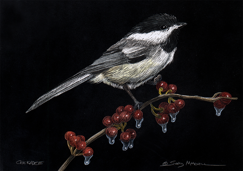Step 4: To add color, use Ampersand Scratchbord/Claybord Inks that are both waterproof and transparent. For best results, build up the color in diluted washes following the directional lines in the drawing. Other brands of ink can leave a heavy residue on the black surface and can be difficult to scratch if not quickly wiped off. For final touch-up, apply Ampersand Black Repair ink around the edges of the subject matter to cover any left-over residue and over-painting. Once all the color is in, go back and scratch out the highlights. This will give the forms in your drawing volume and dimension. Add more color where needed and repeat this process until you are totally satisfied with the results.