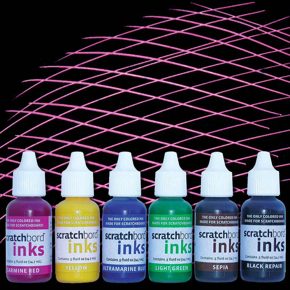 Add vibrant color and repair unwanted marks with Ampersand Scratchbord/Claybord Inks. These transparent, lightfast inks are tested to work perfectly with Scratchbord and Claybord. The Black Repair ink allows artists to cover unwanted lines in their artwork. (Sold Separately)