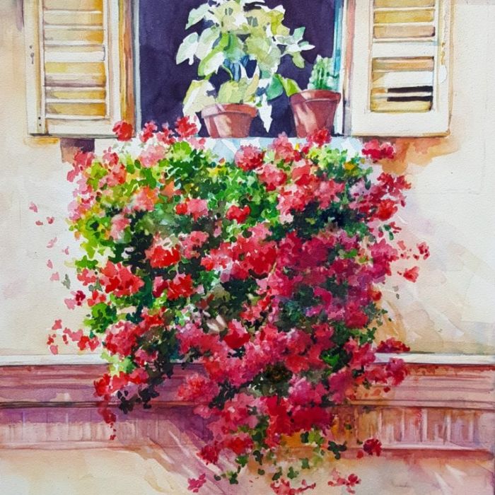 Karen Vernon's painting Windows of the World is an 11x14 watercolor on Ampersand Aquabord. Take a look at the many layers of color that have been applied to this beautiful painting.
