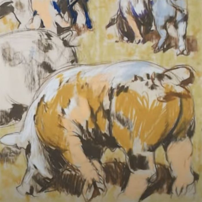 Techniques for how to draw pigs using Caran d'Ache Neocolor II crayons on Unprimed Basswood. Demo led by Teaching Artist Deepti Menon and Art Prof Clara Lieu.